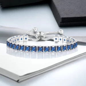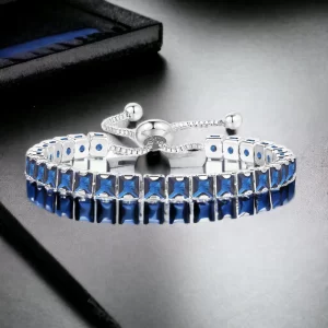 A sleek silver-plated tennis bracelet featuring square-cut navy blue cubic zirconia stones. Anti-tarnish, elegant, and perfect for adding a refined touch to any outfit.