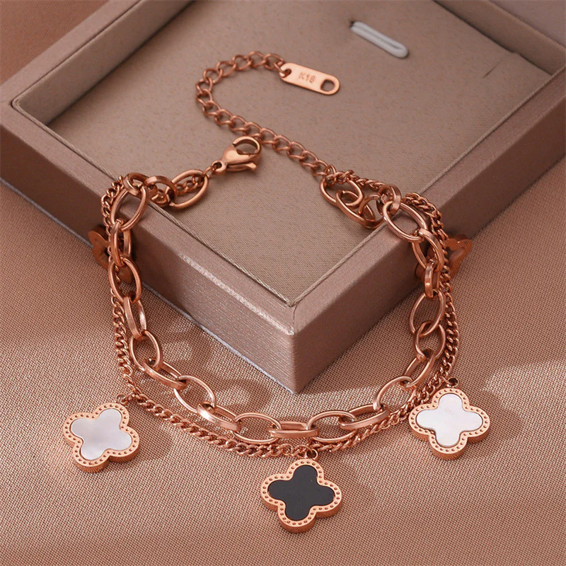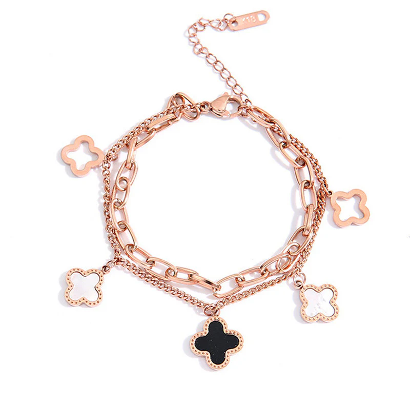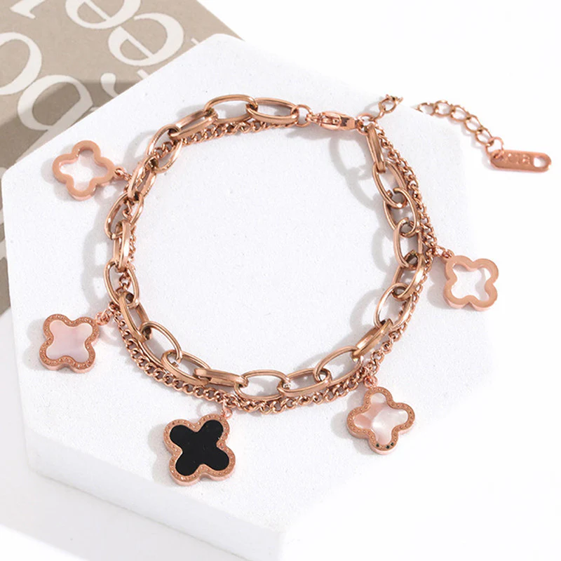 A beautiful rose gold–plated stainless steel wraparound bracelet featuring an elegant mother-of-pearl clover charm. Anti-tarnish, durable, and perfect for adding a soft, feminine touch to everyday style.